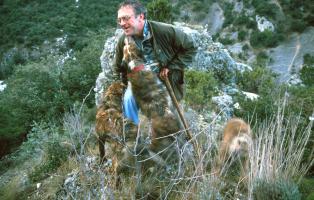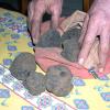 Inzwischen kenne ich die Handelsplätze und bin sogar bis zu den Trüffelsuchern vorgedrungen. Die streifen durch die Landschaft, bis die Hunde Witterung aufgenommen haben und den Trüffelsucher alarmieren. Der fördert dann mit einer kleinen Schaufel (Picouloun) den Fruchtkörper zutage. Bringt der Hund die Trüffel selbst, nimmt ihn der Sucher mit Daumen und Zeigefinger aus dem Maul, öffnet dabei die anderen drei Finger und gibt so einen Biskuit frei, mit dem das Tier für die Trüffelübergabe belohnt wird.