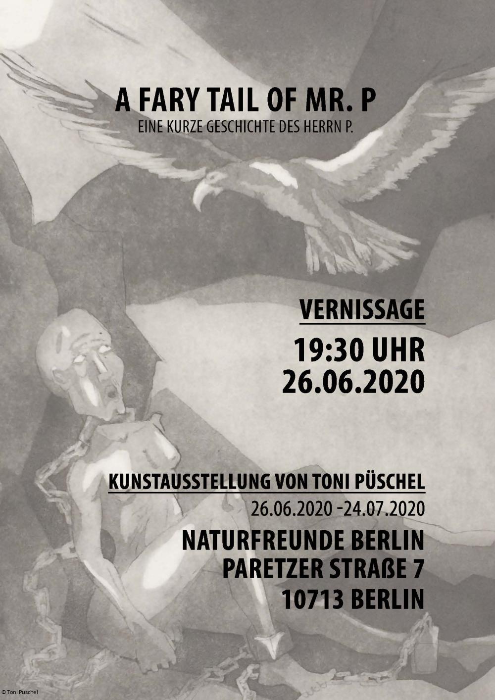 Am 26. Juni startet die Ausstellung „A fairytale of Mr. P.“ in der NaturFreunde-Galerie in der Paretzer Straße. Die Ausstellung ist eine erste spannende Zusammenfassung der letzten acht Jahre aus dem kreativen Schaffen des Künstlers, mit Aquarellzeichnungen, Acrylmalerei und Plakaten zu verschiedensten Themen. Ein Highlight sind sicher die Radierungen von Toni Püschel. Außerdem ist eine Serie von neun Drucken aus der griechischen Mythologie des Prometheus ausgestellt. In seinem Schaffen lässt sich der Künstler Toni Püschel nur schwer auf eine Maltechnik bzw. Methodik festlegen. Toni wurde Anfang der 80er in der „Fontanestadt” Neuruppin geboren. Er begann mit Holzbildhauerei und Graffiti. Die Holzbildhauerei hat er bei der Künstlerin IngoR gelernt, die Sprühkunst in vielen abenteuerlichen Nächten sich selbst beigebracht. Das war bis 2004. Toni Püschel ist Mitglied der Künstlergruppe Tendenzen Berlin, aktuell lebt und arbeitet er im Berliner Wedding.